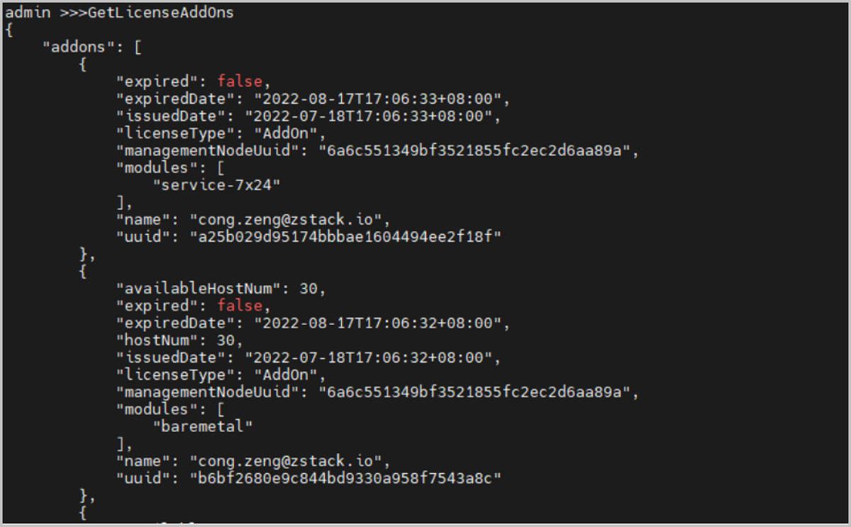 [root@localhost ~]# zstack-cli admin >>> LogInByAccount accountName=admin password=$password  //密码为平台admin用户密码  admin >>> GetLicenseAddOns