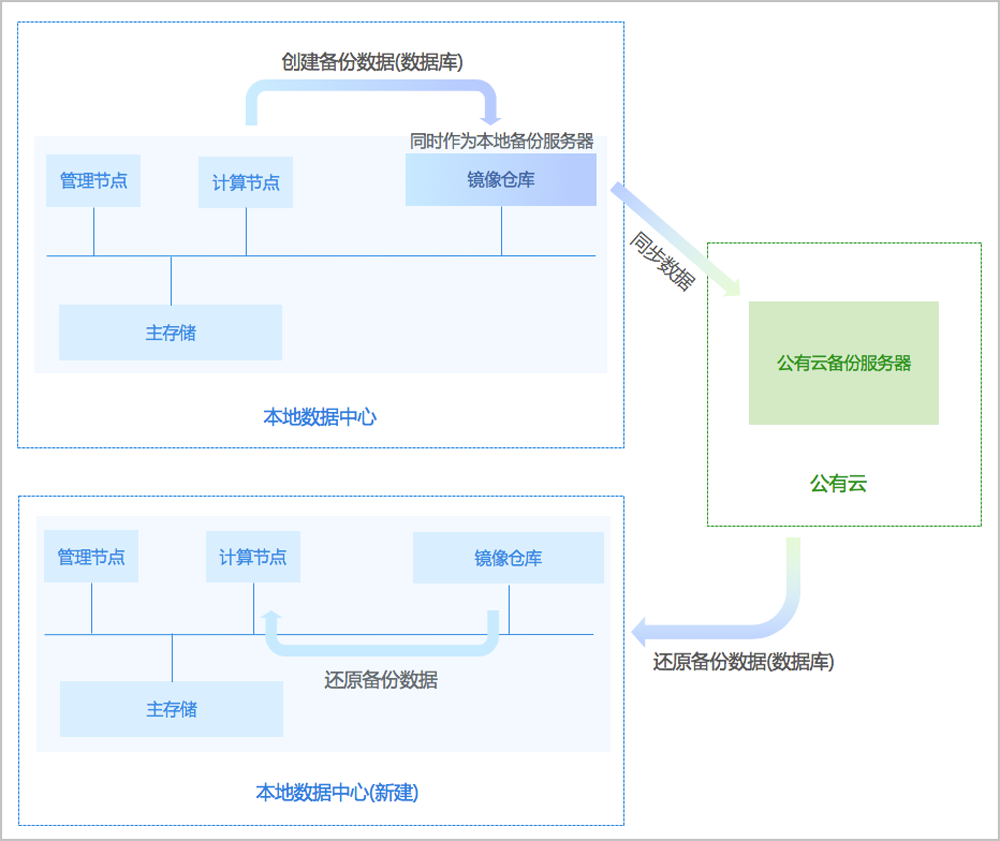 支持将本地部署的镜像仓库作为本地备份服务器,用于存放本地云主机/数据云盘/弹性裸金属实例/管理节点数据库(简称数据库)的定时备份数据。同时本地备份服务器支持主备无缝切换,有效保障业务连续性。