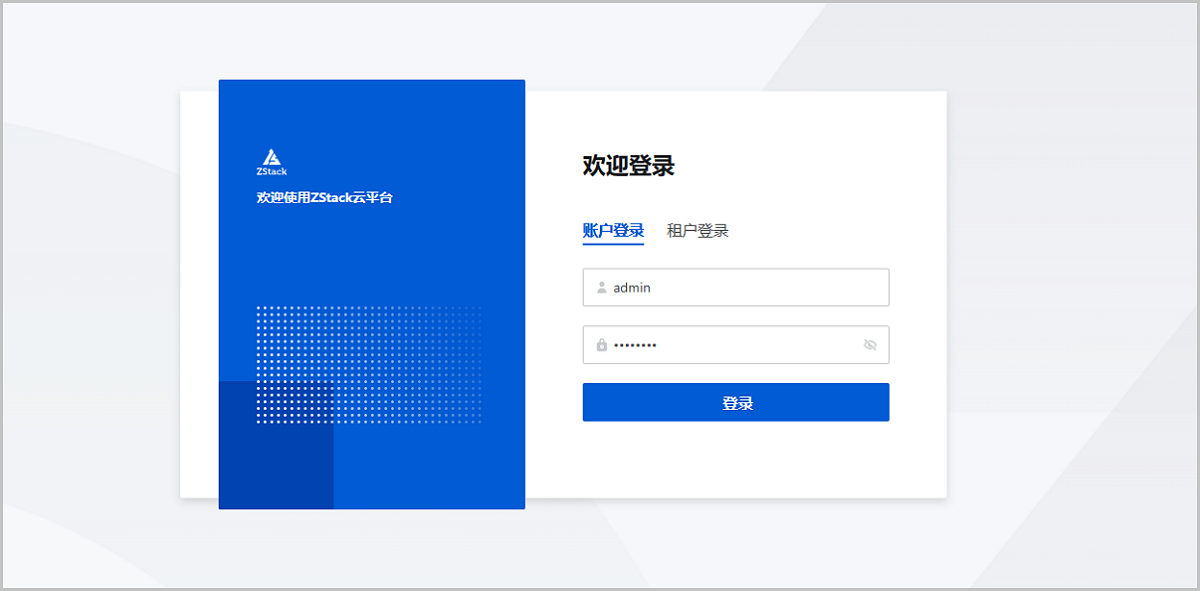 使用Chrome浏览器或FireFox浏览器打开主登录界面(http://management_node_ip:5000/#/login),admin输入相应用户名和密码登录云平台。