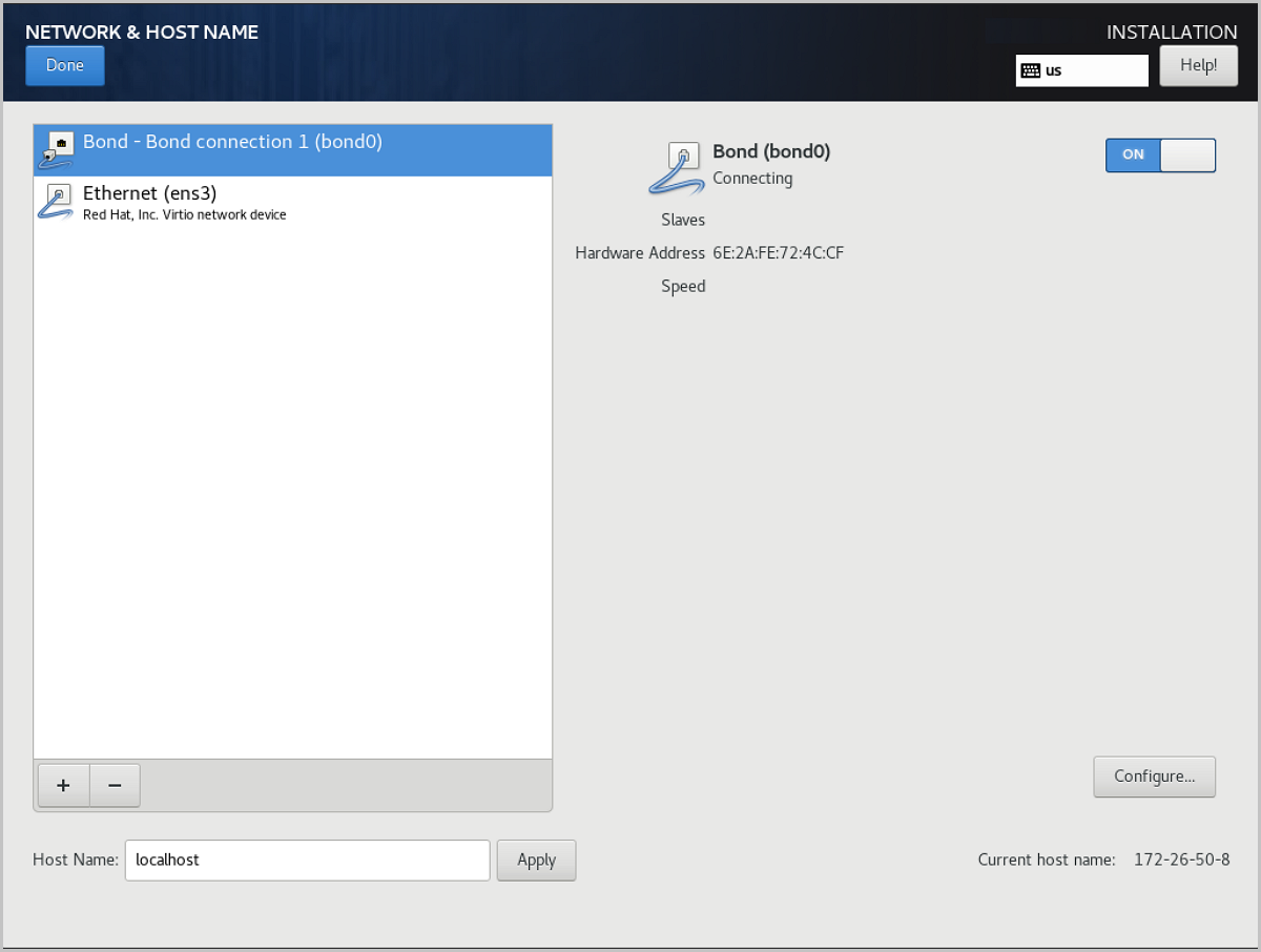 1. 安装配置汇总界面,点击NETWORK & HOST NAME > Ethernet(ens3) > Configure...,弹出ens3配置界面。点击IPv4 Settings > Method > Manual,用于切换IP地址获取方式为手动指定。