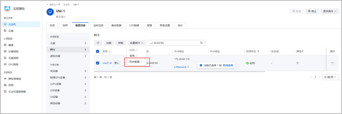 ZStack Cloud 4.7.11开始,支持基于性能优化工具下发和读取IPv6地址。无DHCP服务场景下,用户在云平台设置IPv6及其他网络参数后,点击网卡操作列表的“同步配置”,即可通过性能优化工具将参数下发到网卡生效。