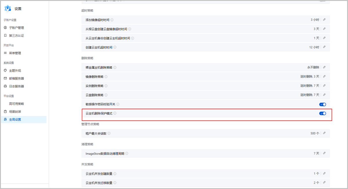 图 1. 全局设置:云主机删除保护模式