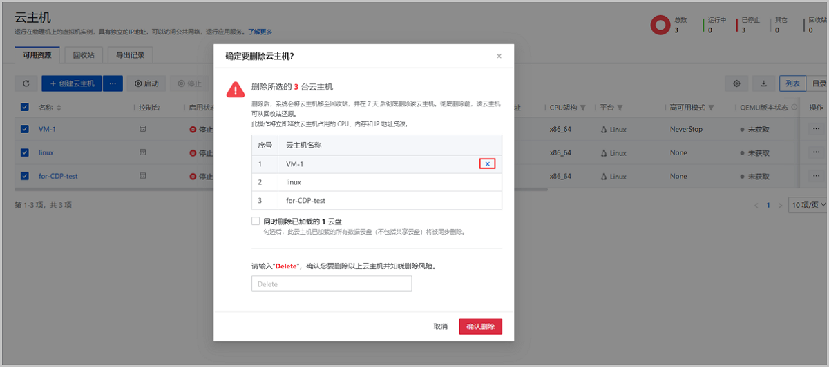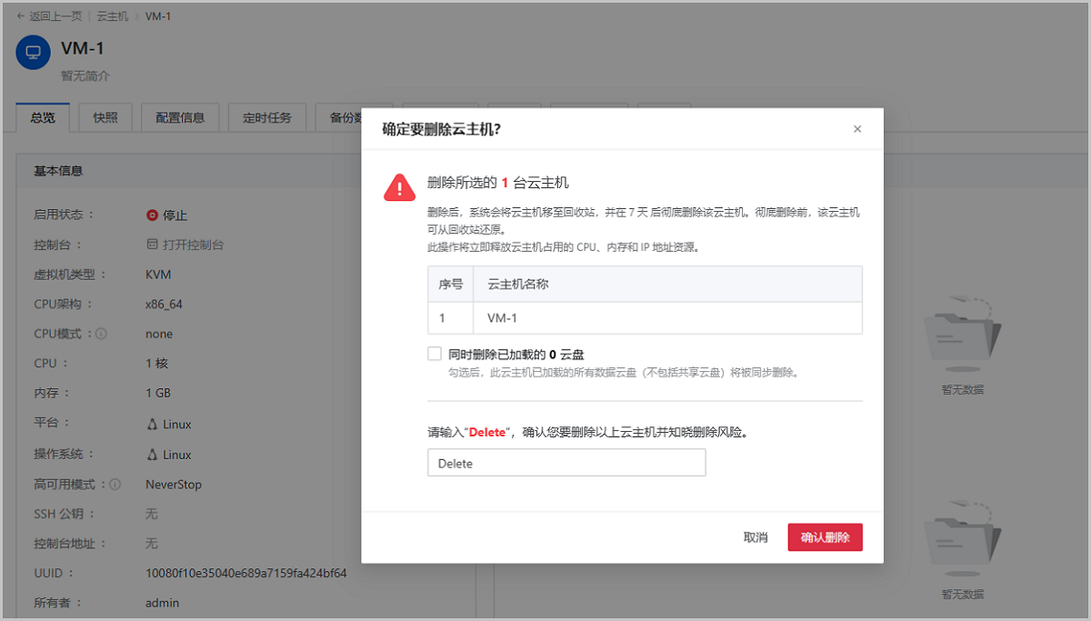图 2. 删除/彻底删除云主机需输入确认文本