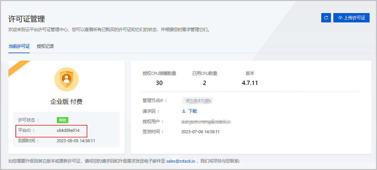 ZStack Cloud 4.7.11开始,云平台许可证管理页面新增平台ID,作为产品唯一码可供用户查询。