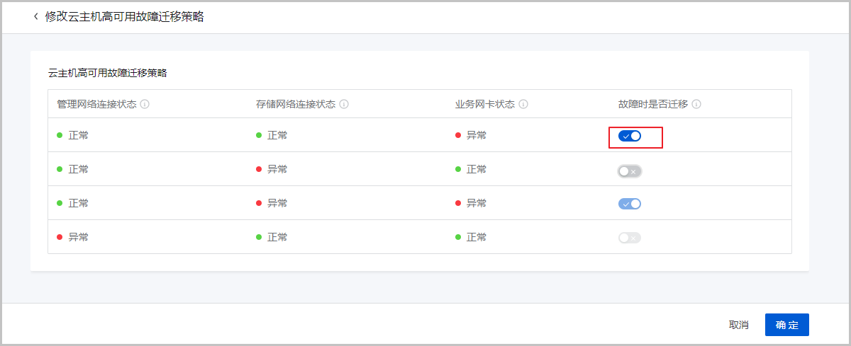 ZStack Cloud 4.7.0 开始,新增支持一键开启/关闭云平台范围内云主机高可用策略。开启后,支持通过真值表一键配置云主机故障迁移策略,包括管理网络连接状态、存储网络连接状态、业务网卡状态故障时的高可用迁移策略。