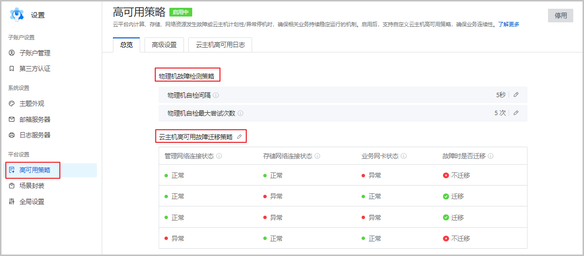 同时,云平台汇集了所有与云主机高可用相关的全局设置,方便用户一键自定义配置云主机高可用策略。