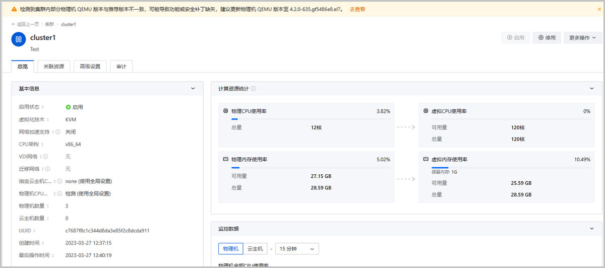 • 云主机/集群粒度的QEMU展示与告警:按云主机/集群粒度展示资源QEMU状态,便于用户及时更新QEMU版本,避免安全补丁缺失或功能不全问题