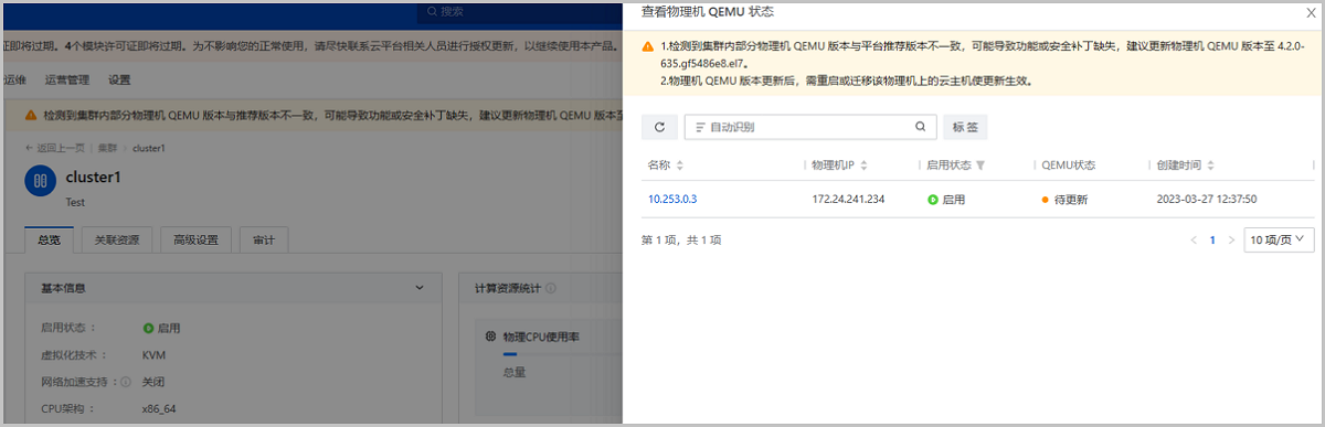 图 1. 集群详情页QEMU版本异常提醒
