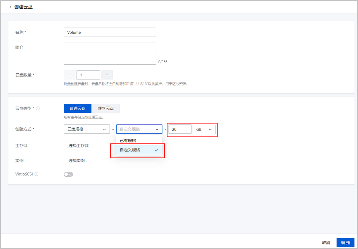 ZStack Cloud 4.6.11开始,创建数据云盘支持自定义规格,直接指定云盘大小。云盘创建不再受已有云盘规格的前置条件约束,更好覆盖云盘快捷创建的场景。