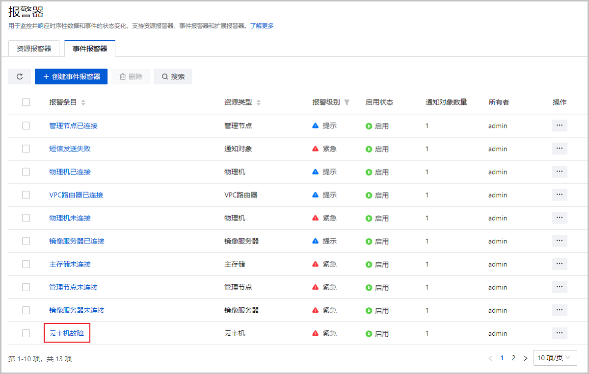 ZStack Cloud 4.2.0新增了用于检测云主机常见故障的默认事件报警器。当云主机出现故障时将及时发出告警,运维人员可以快速响应并处理,保证业务系统始终处于健康状态。同时支持手动创建云主机故障报警器,通过自定义接收端掌握关键业务云主机健康信息,保证业务稳定运行。