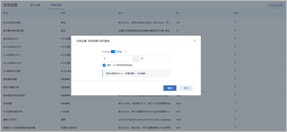 在全局设置中开启“密码强度”开关后,用户可自定义设置密码长度范围,并使用数字、大小写和特殊字符组合的密码策略,如图 1所示: