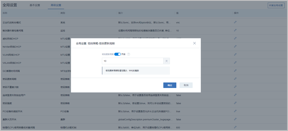 在全局设置中开启“密码更新周期”开关后,用户可自定义设置密码更新周期。建议定期修改云平台登录密码,保障登录安全,如图 2所示: