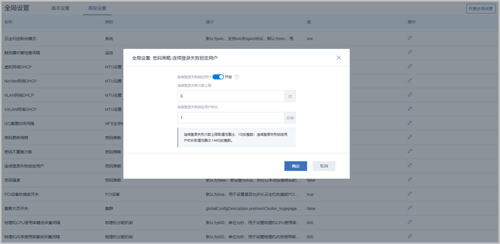 在全局设置中开启“连续登录失败锁定用户”开关后,用户可自定义设置连续登录失败次数上限、以及连续登录失败锁定用户时长。当连续登录失败次数超过设置值,用户账户将被锁定一段时间,保障登录安全,如图 4所示: