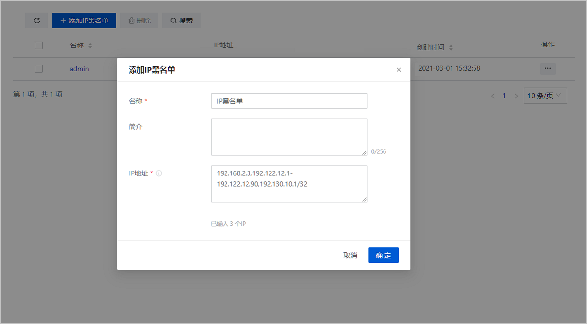 说明: 添加IP黑/白名单,该名单将立即生效,名单中的IP地址将被拒绝/允许登录云平台,请谨慎操作。
