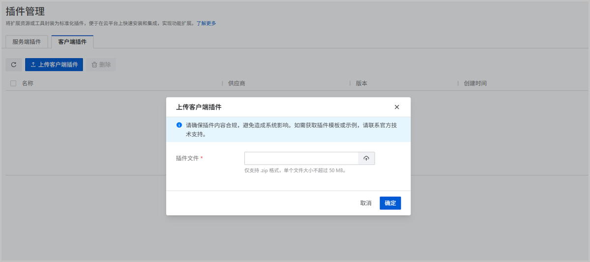 在插件管理界面,点击客户端插件,进入客户端插件界面。点击上传客户端插件,弹出上传客户端插件界面。