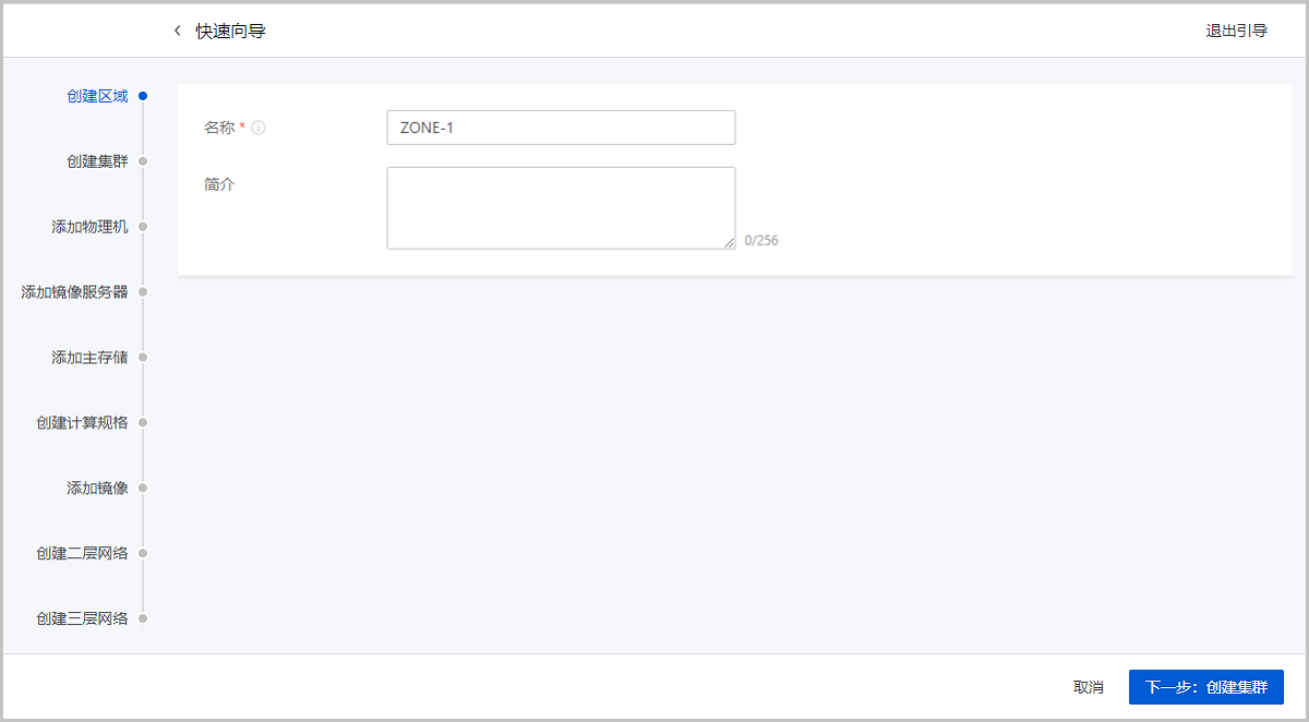 区域:云平台内最大的一个资源定义,包括:集群、二层网络、主存储等资源。