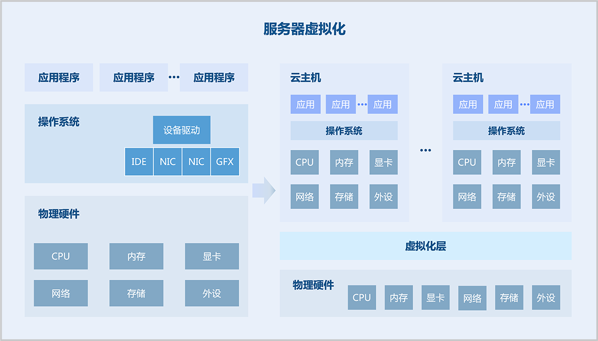 计算虚拟化是将物理服务器资源通过虚拟化技术抽象成逻辑资源,让一台物理服务器变成多台相互隔离的虚拟服务器,CPU、内存、磁盘、I/O设备等硬件资源变成虚拟化资源池进行统一动态管理,从而提高资源利用率,降低系统管理成本,让IT对业务变化更具适应力。