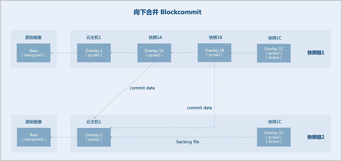 外部快照之间互相依赖(每一个overlay依赖它的backing file),每个快照保存有相应数据,不可直接删除某个快照来缩短链长度。外部快照可通过向下合并(Blockcommit)或向上合并(Blockpull)两种方式来缩短链长度。