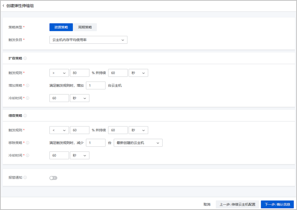 设置伸缩策略配置有资源策略与周期策略两种策略类型: