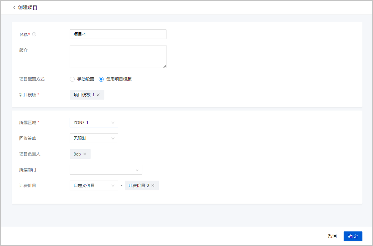 • 所属部门:可选项,可将项目加载到部门,加载后支持按部门计费,本场景暂不选择