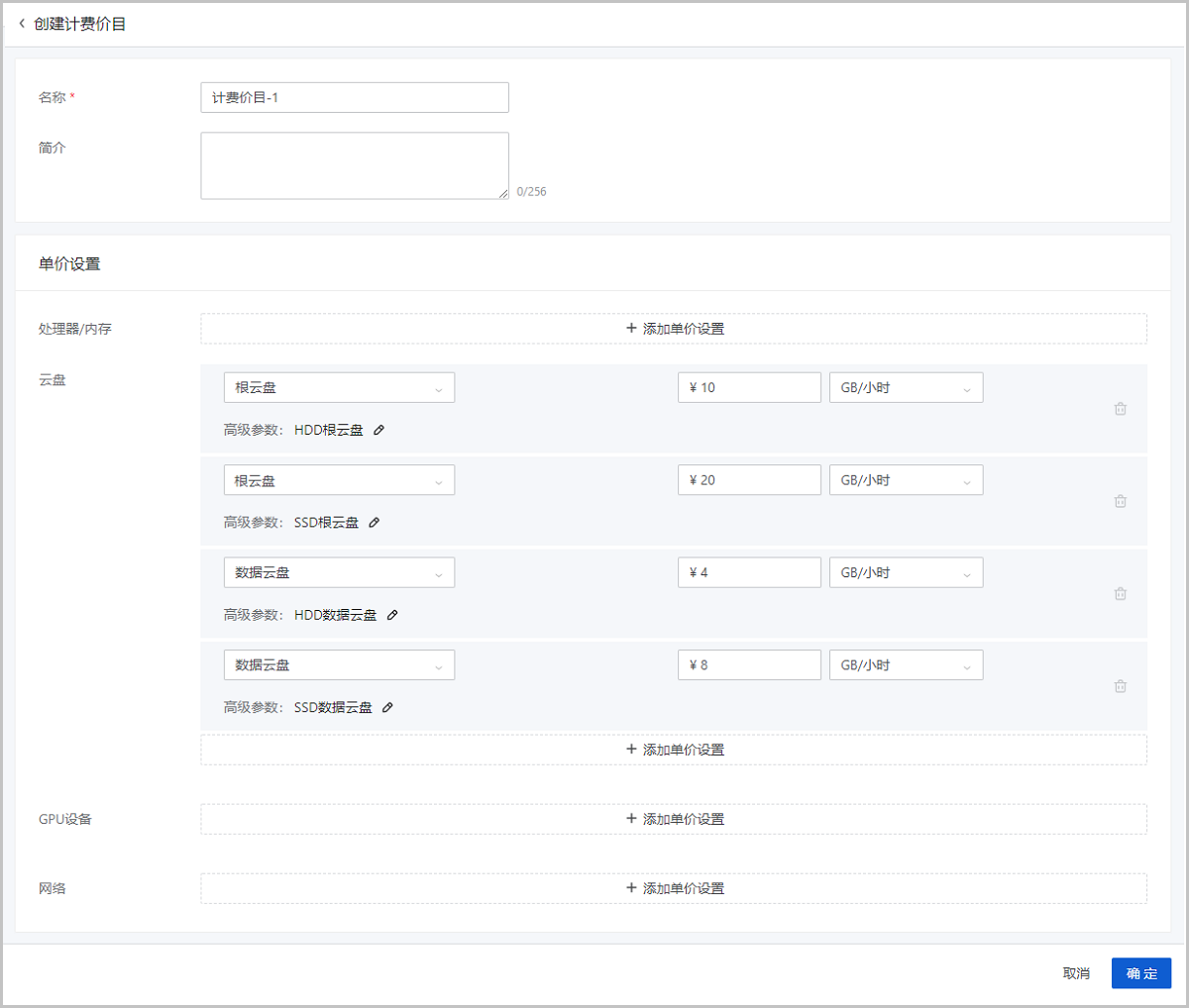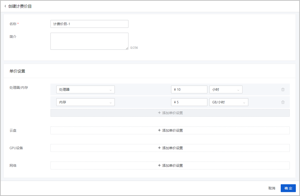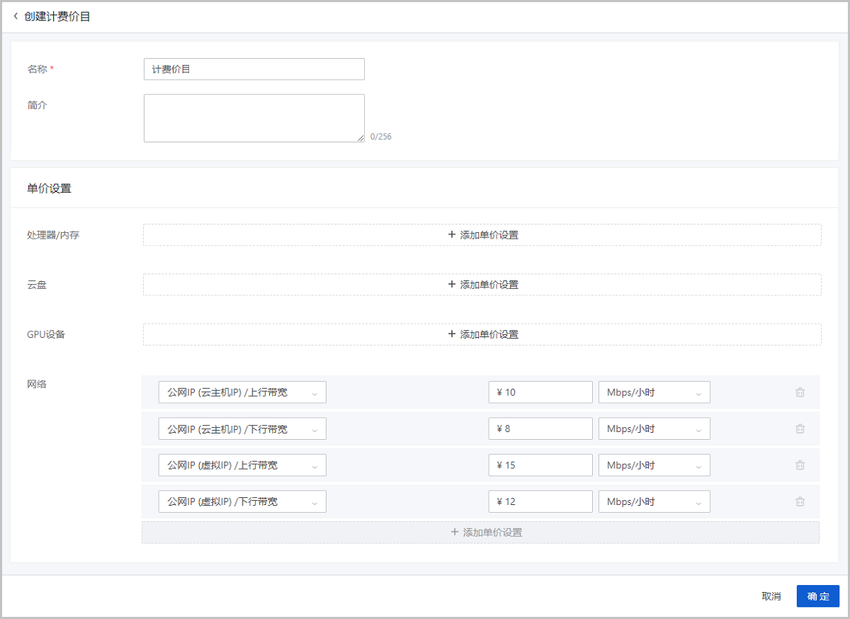 • 单价设置:点击添加单价设置按钮,按需为不同资源设置单价