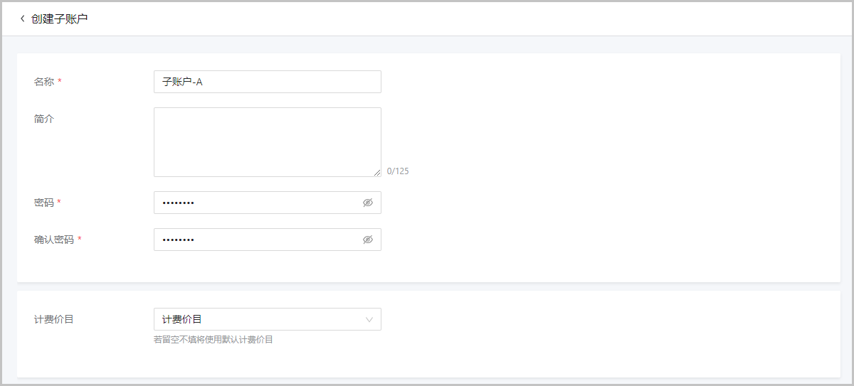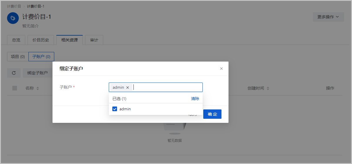 重复上述步骤,创建子账户-B,并绑定计费价目。