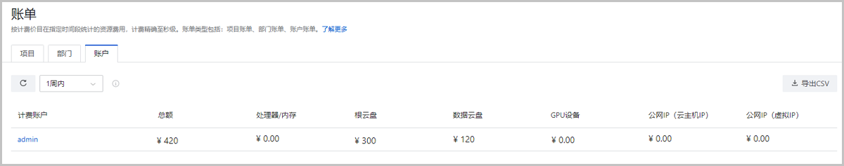 • admin视角项目账单页面默认实时查看汇总账单。