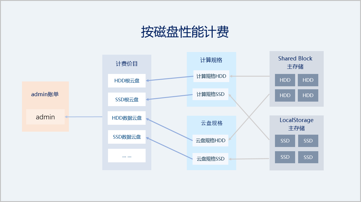 场景设定:上海某公司为了合理利用存储资源,分别采购了一批HDD硬盘服务器(搭建Shared Block主存储)和一批SSD硬盘服务器(搭建Local Storage主存储),需要对不同性能的磁盘设置不同价格进行计费。本场景将通过admin视角,以Local Storage主存储和Shared Block主存储为例,结合计算规格/云盘规格高级配置,详细介绍按磁盘性能计费功能。