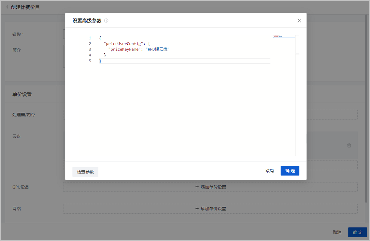 说明: 此配置条目依赖计算规格高级参数中的priceUserConfig信息,请确保配置严格一致,否则不能生成计费账单。