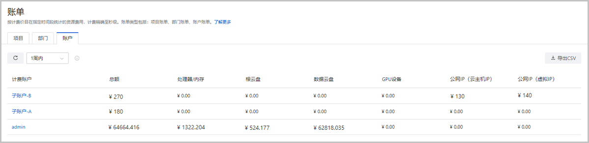 • 点击子账户名称,支持以资源为单位定时查看资源账单。