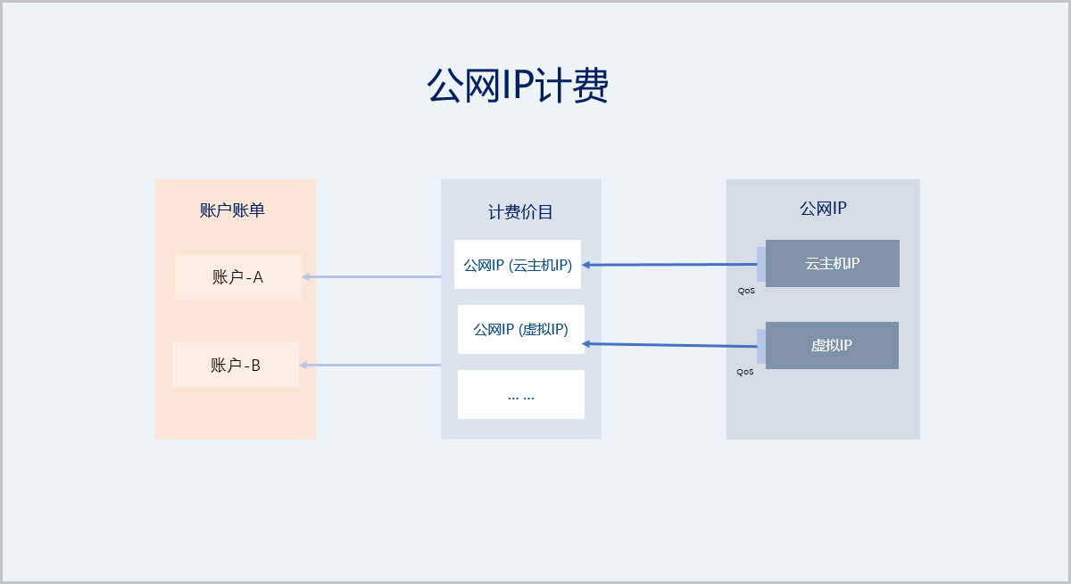• 公网IP(云主机IP):表示云主机网卡占用的公有网络IP地址资源,对此公网IP设置QoS即可进行计费。
