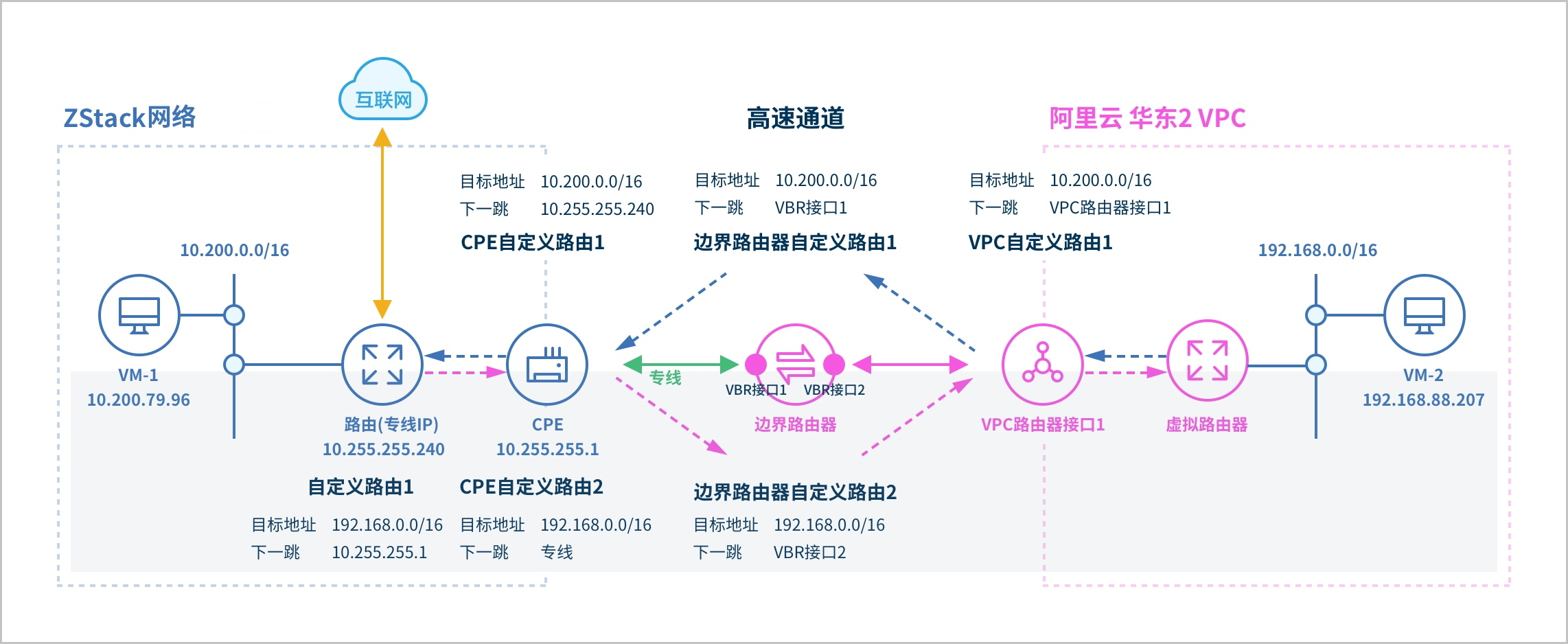 ZStack Cloud支持阿里云高速通道方式实现本地VPC网络与阿里云VPC网络的互通。