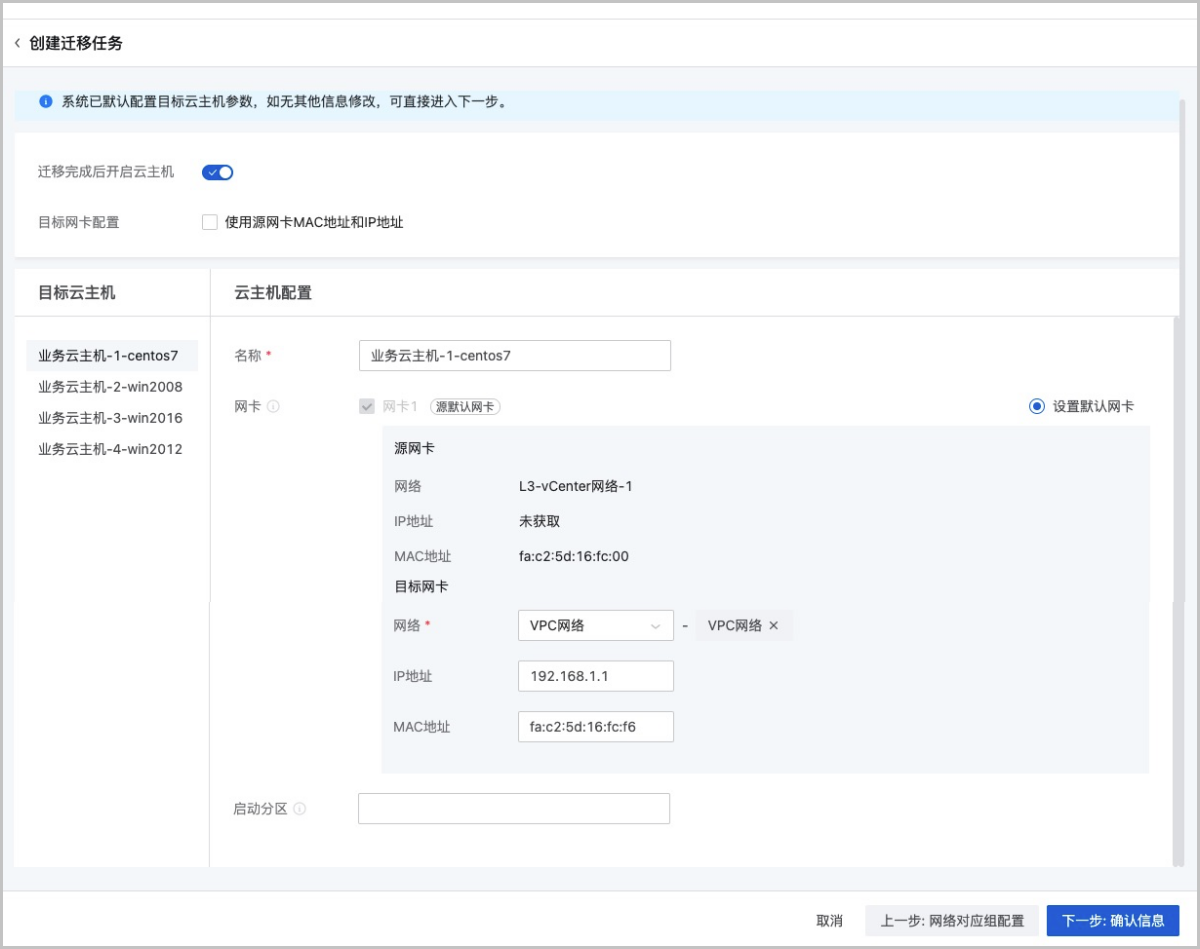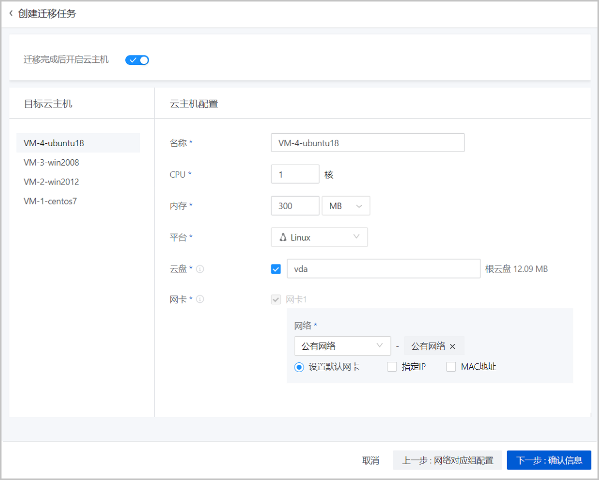 由于系统已默认配置目标云主机参数,用户如无其他信息修改,可直接进入下一步。
