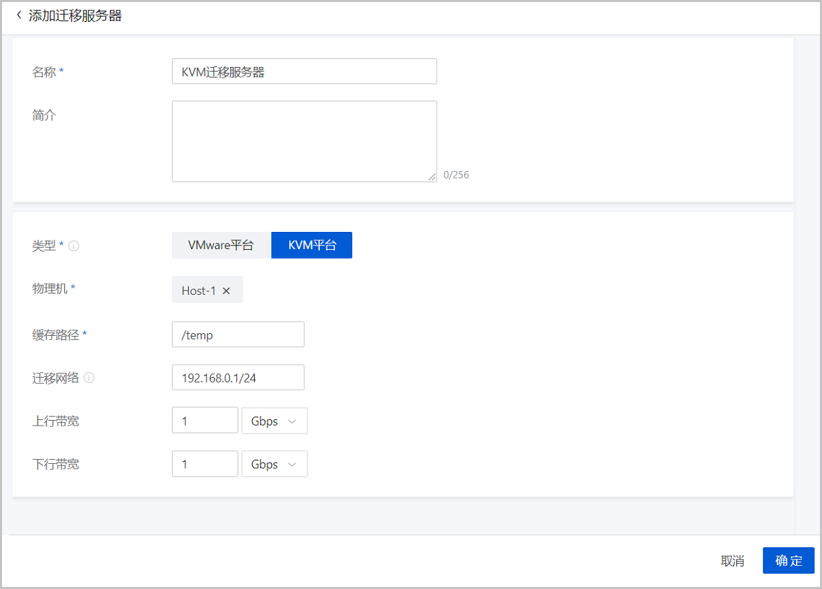 • 上行带宽:可选项,设置迁移服务器的上行带宽,将限制从迁移服务器到目标主存储的上传速度,需输入整数,单位:Mbps/Gbps,取值范围:1Mbps~32Gbps。