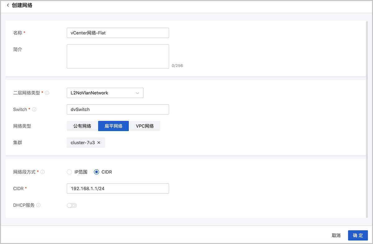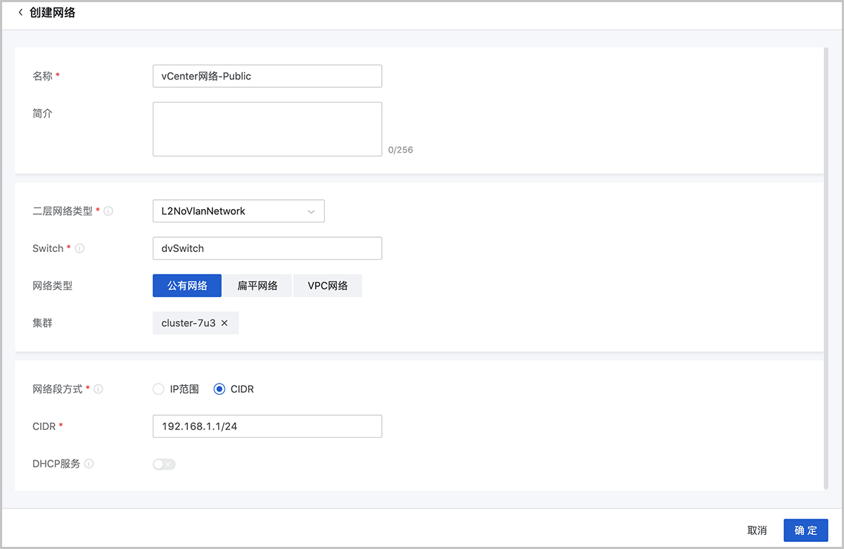 创建vCenter网络 创建一个vCenter网络,网络类型包括:公有网络、扁平网络、VPC网络。