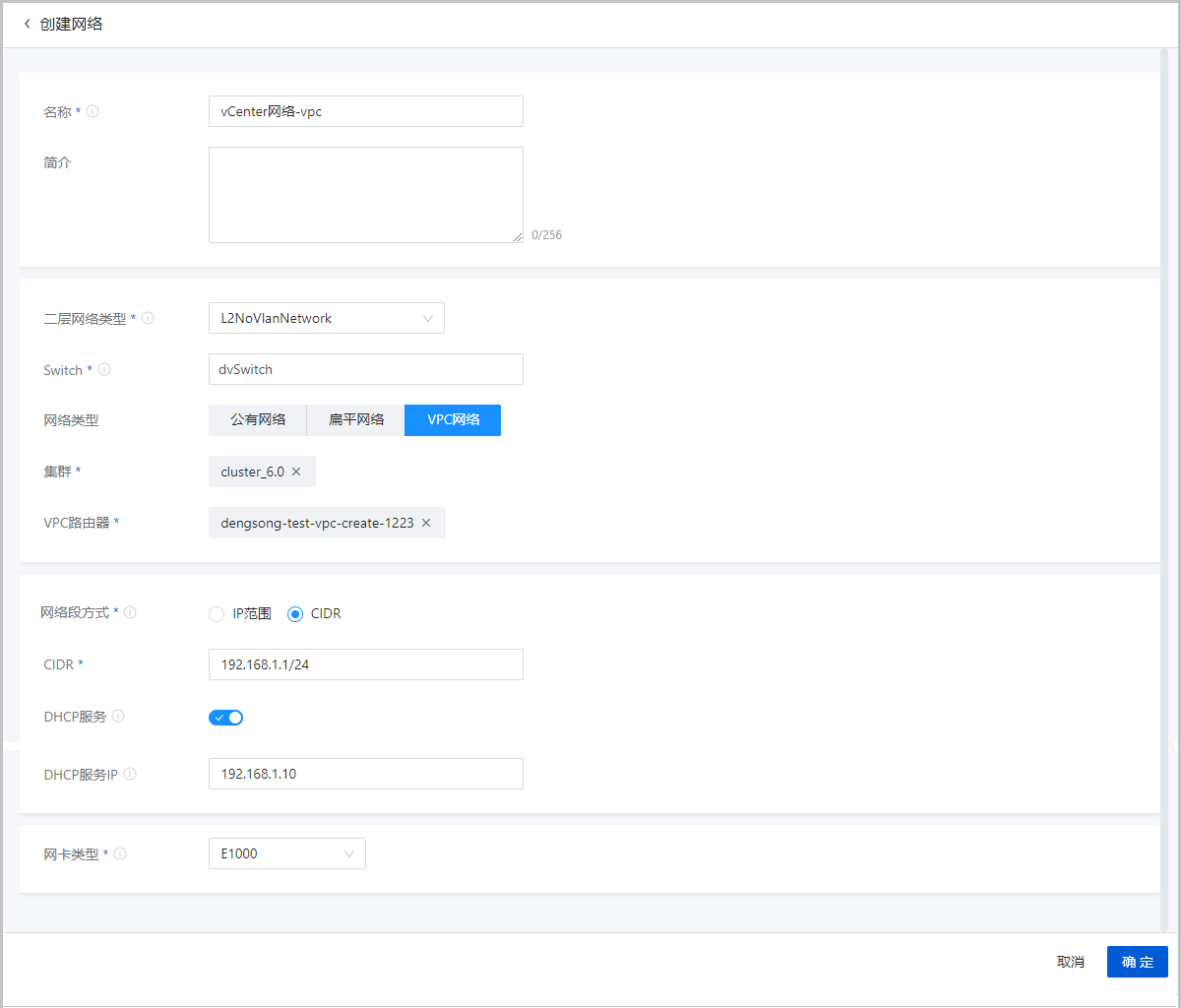 • 创建vCenter VPC网络,需提前在网络资源中准备好VPC路由器。