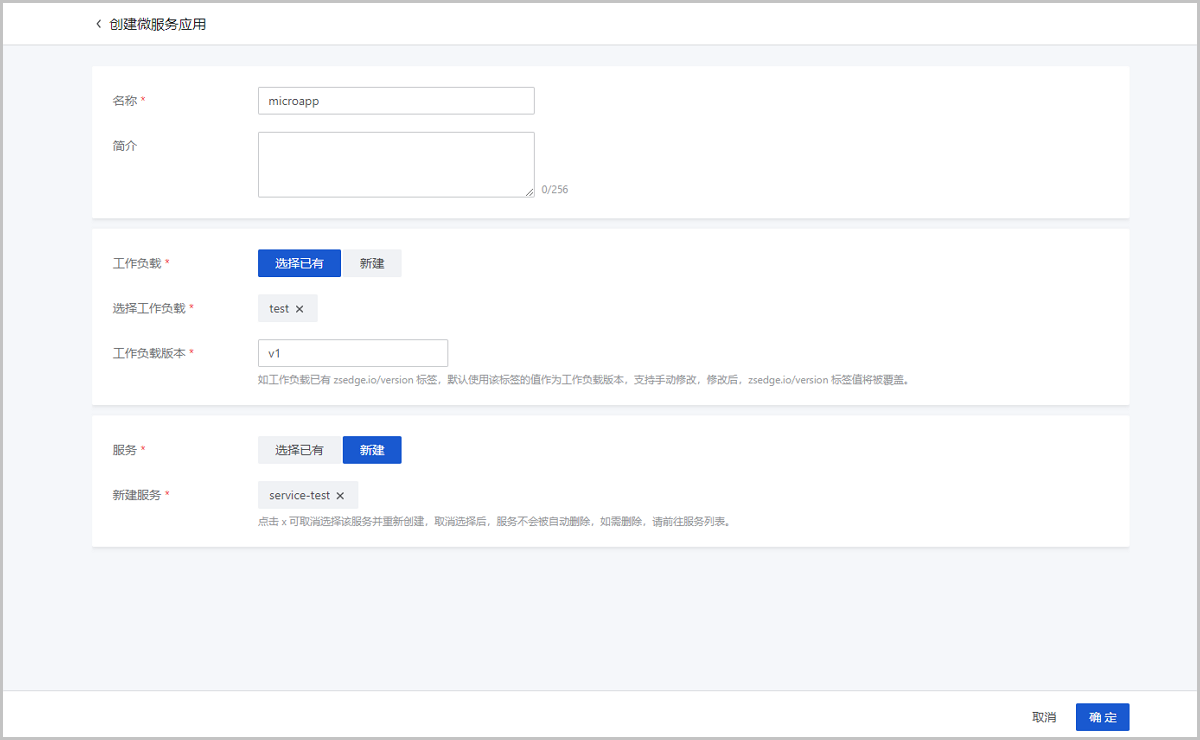 在ZStack Zaku主菜单,选择。在微服务应用界面,点击创建微服务应用,弹出创建微服务应用界面。