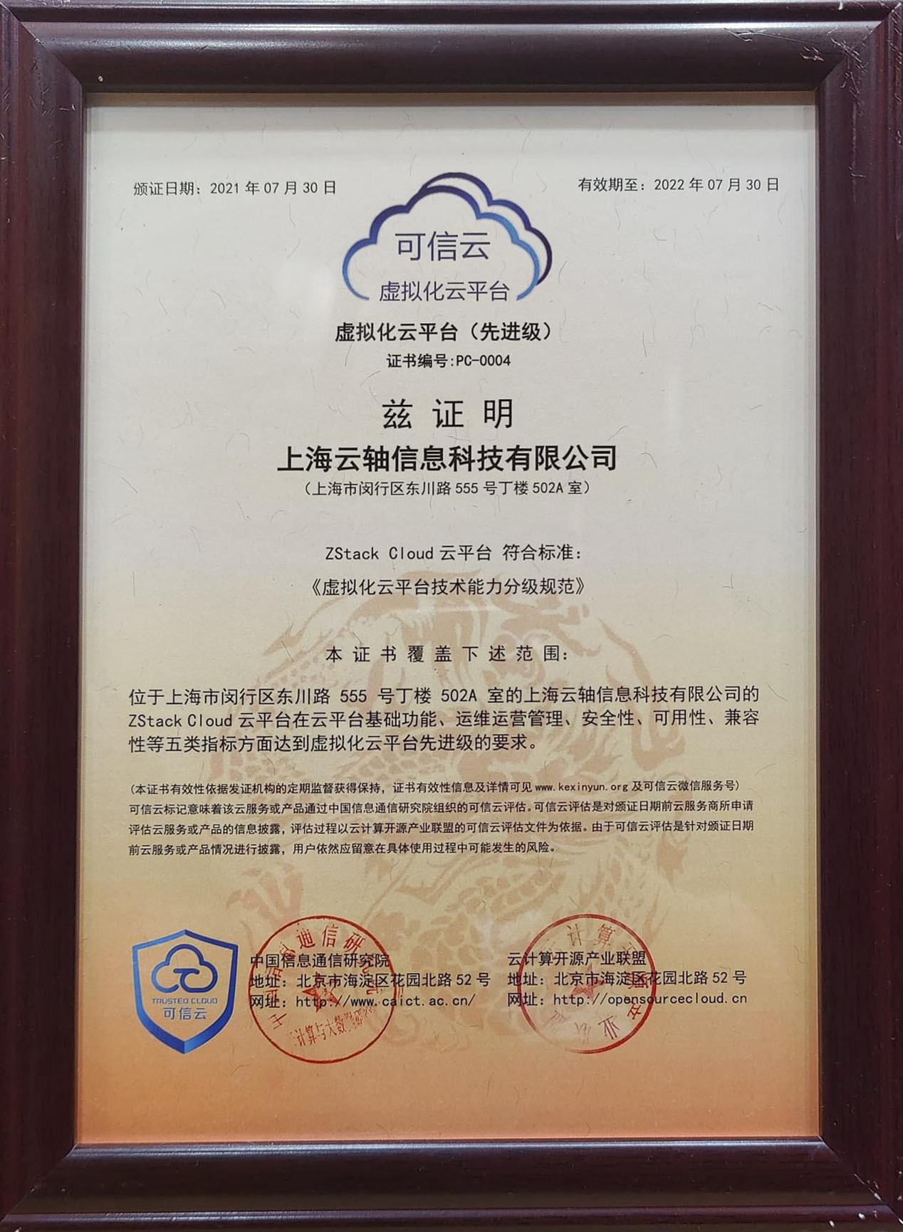 7月27-28日,由中国信息通信研究院、中国通信标准化协会主办的“2021可信云大会”在北京举行。ZStack作为云计算标准和开源推进委员会成员单位受邀参会,在大会发布的“可信云•云软件较新评估结果”中,荣获首批“可信云•虚拟化云平台(先进级)”认证。同时,ZStack的售前技术总监梅磊,也荣获了“可信云标准个人专家奖” 。